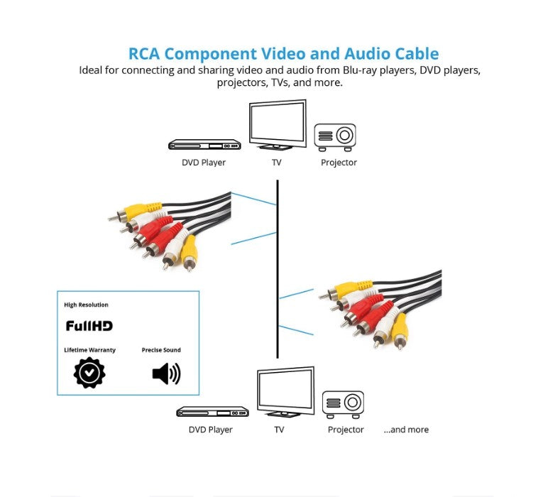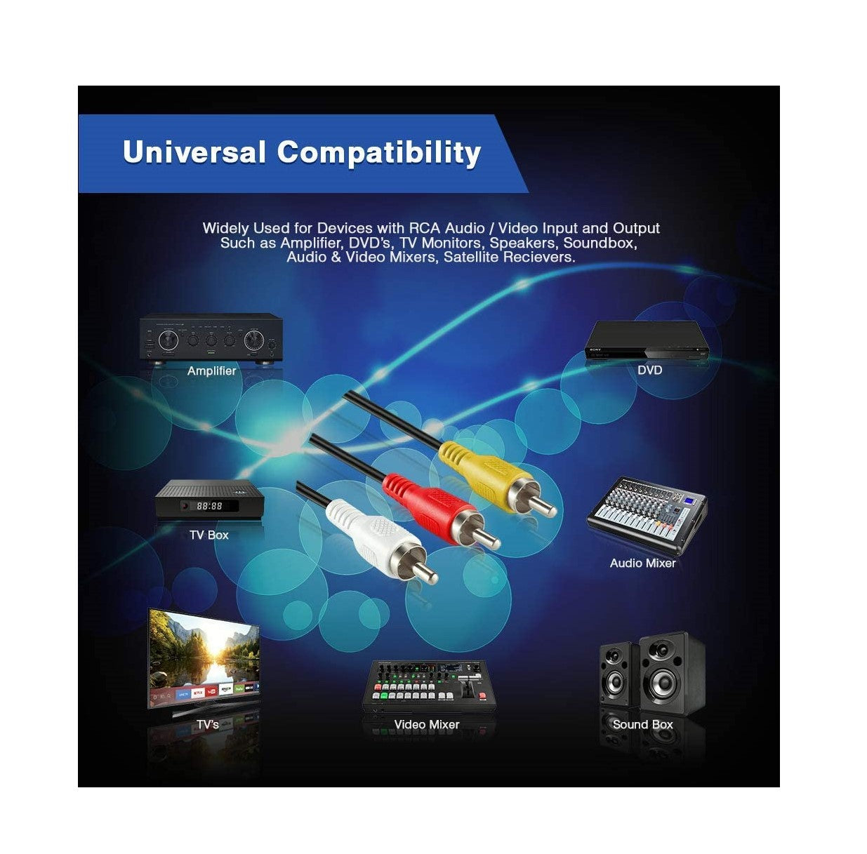 - Compatible with any RCA audio/ video devices like home theater, DVD player, Camcorder, DSS receivers, and more.